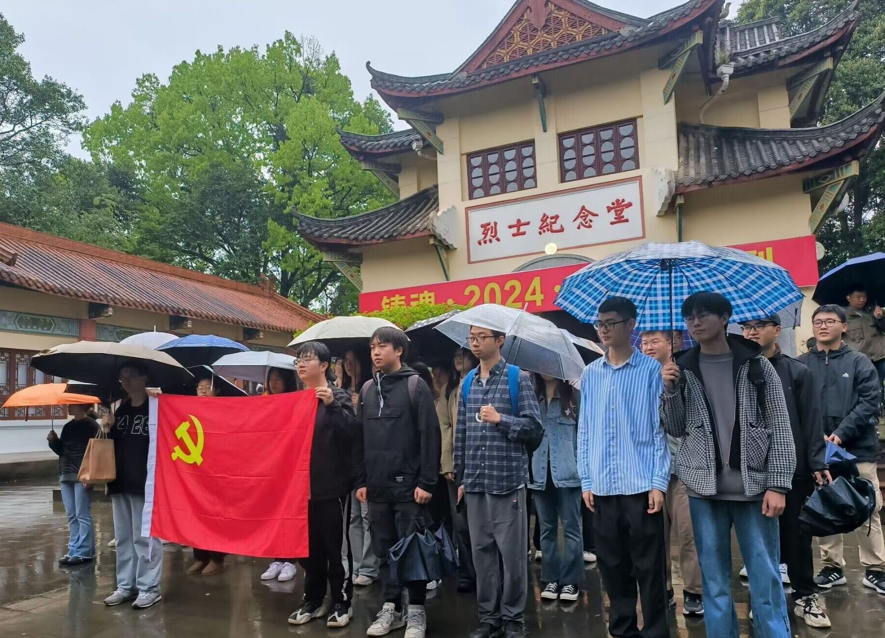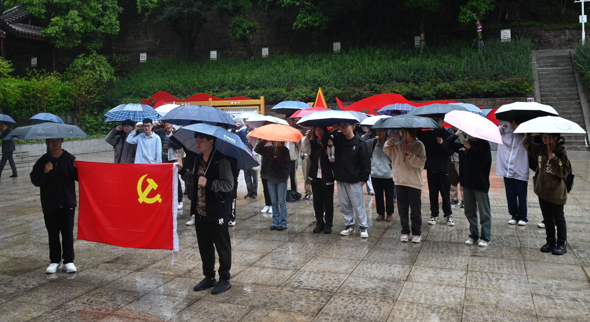 全体预备党员肃立烈士陵园广场,举行了一场预备党员宣誓仪式。在舒悦同志的带领下,同志们面向党旗庄严宣誓,誓词阵阵,慷慨激昂。天空细雨霏霏,为仪式增添了肃穆庄重之感。