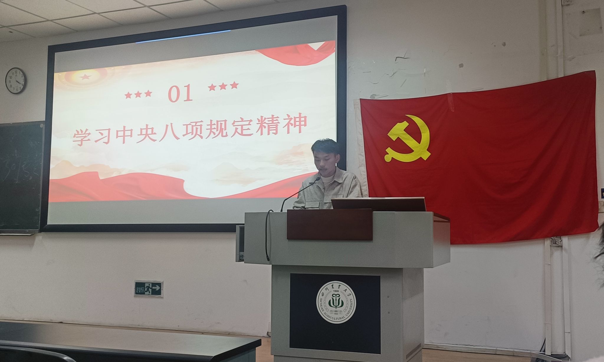 会上,周发宝同志围绕学习贯彻中央八项规定精神,结合“建书香支部”活动进行了主题发言,深入阐述了以八项规定为镜,筑牢作风根基的重要性,并推荐了红色经典书籍《红岩》。他指出,本次组织生活旨在贯彻落实党的二十届三中全会部署,巩固拓展学习贯彻习近平新时代中国特色社会主义思想主题教育成果,巩固深化党纪学习教育成果,锲而不舍落实中央八项规定精神,推进作风建设常态化长效化。随后,周发宝同志指出,《红岩》不仅塑造了江姐、许云峰等英雄群像,更深刻揭示了共产党人的精神密码,其“舍生取义”的气节是新时代党员的精神坐标。他希望同学们通过阅读经典,从红色基因中汲取力量,坚定理想信念。