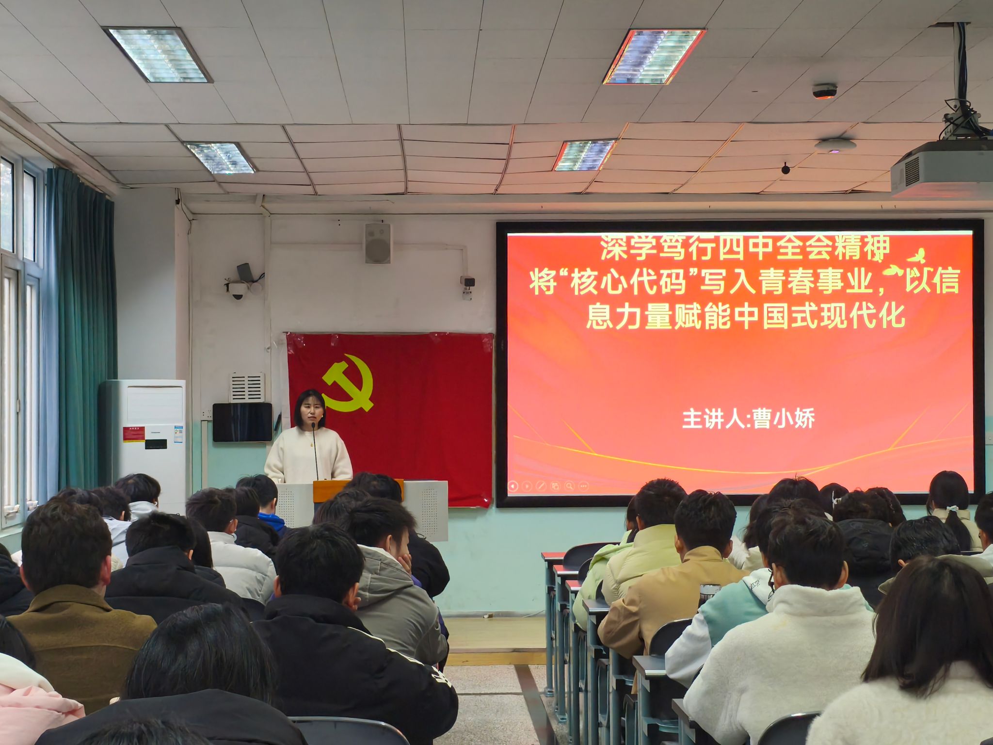 会上,第一党支部书记曹小娇老师结合全会审议通过的《建议》,从全会召开的时代背景,对推进中国式现代化的重大意义出发,清晰梳理了全会精神的逻辑脉络,深入解读了其中的新思想、新论断、新部署,并重点讲解了“十五五”时期经济社会发展的主题、根本动力、关键支撑、价值导向和根本保证等核心内容。她强调,“十五五”时期的发展目标为青年的成长成才指明了方向,青年应在理论武装、专业本领提升、社会服务实践、个人品德修养四个维度持续用力,切实将全会精神内化于心、外化于行,做到知行合一。