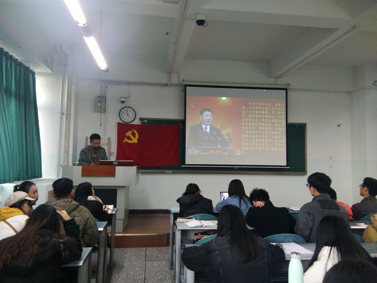 习近平总书记在广东考察时强调:高举新时代改革开放旗帜,把改革开放不断推向深入。为深入学习我国改革开放在进入新时代后面临的新挑战与新机遇,11月27日下午,信息工程学院学生党支部在十教A409组织了以“深入贯彻习近平总书记广东考察重要讲话精神”为主题的学习讨论,全体学生党员和重点发展对象参与了本次学习。