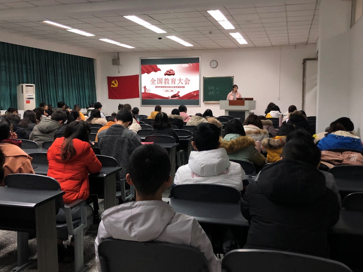 然后我院学生计算机专业党支部预备党员徐婷同志就“全国教育大会”习近平总书记重要讲话部分重点解读了:“教育是民族振兴、社会进步的重要基石;是功在当代,利在千秋的德政工程;是国之大计,党之大计。”并播放视频帮助理解学习。