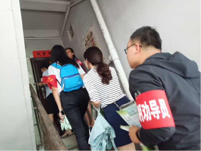 6月18日,学院党支部志愿者和西大街社区工作人员一起挨家走访住户进行环保宣传活动,倡导市民做好环保工作。