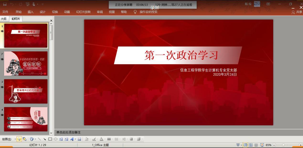 2020年3月24日星期二下午4:20,由于疫情原因信息工程学院计算机党支部在线上组织了以“学习新时代雷锋精神——向奋战在疫情防控一线的雷锋致敬”为主题的政治学习分享会,此次分享会由杨检同志主持召开。支部预备党员积极参与,学习气氛浓厚。