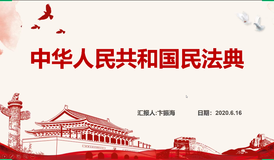 分享会伊始,段文凯同志从维护国家安全的职责分工,公民和组织应履行的义务,公民和组织享有的权利,其他法律责任三个方面介绍了《中华人民共和国国家安全法》;紧接着,卞振海同志围绕2020年通过的《中华人民共和国民法典》,从民法典简介,民法典的重要意义,民法典的主要内容三方面展开学习,并辅以视频帮助各位同志深入了解;最后,陈红玲同志从民法典的意义、编篡历史、鲜明特色,民法典的全面实施以及民法典的普法工作部署等方面展开介绍,并以民法典亮点结束了本次分享,让所有同志均对《中华人民共和国民法典》有了整体的认知。