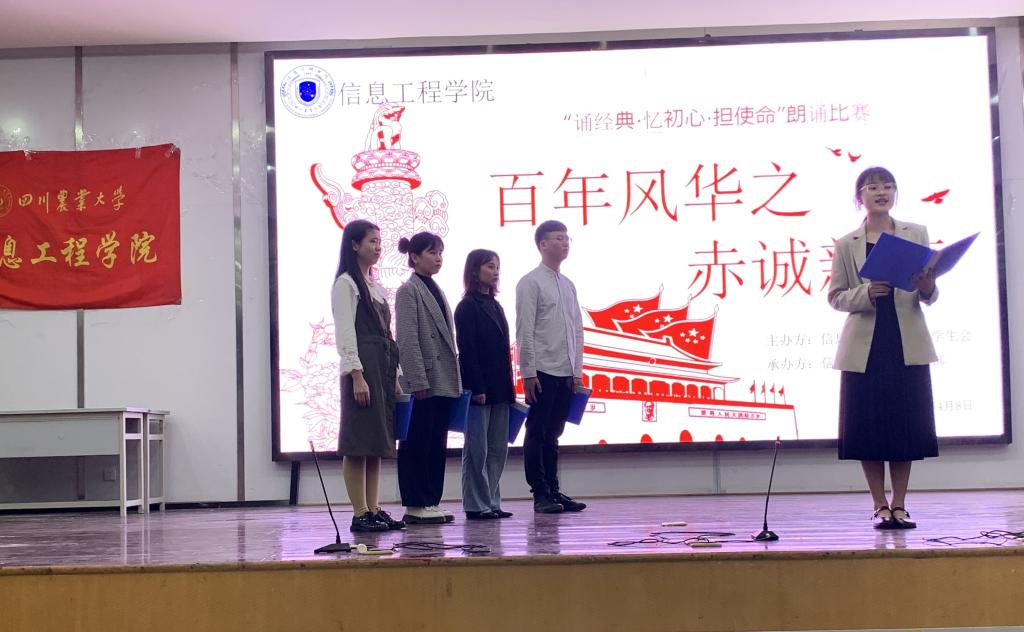 为庆祝中国共产党成立100周年,4月11日晚,信息工程学院在十教二楼小礼堂开展了“百年风华之赤诚‘新’声诵给党”朗诵大赛,前期全院有23个小班、院学生组织和学生党支部参与初赛。通过遴选,最终有11个团队进入现场决赛,学院党委书记王中成、学生辅导员和团学组织主要学生干部担任评委,400余名师生到场观看。