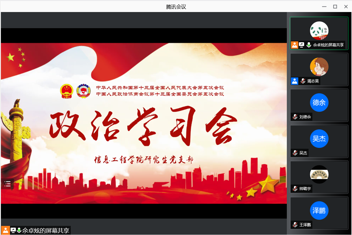 3月5日上午,信息工程学院研究生党支部通过腾讯会议召开政治学习会,学习十三届全国人大五次会议和全国政协十三届五次会议有关内容,支部全体党员和部分入党积极分子参加学习会,学习会由支部宣传委员余卓炫同志主持。