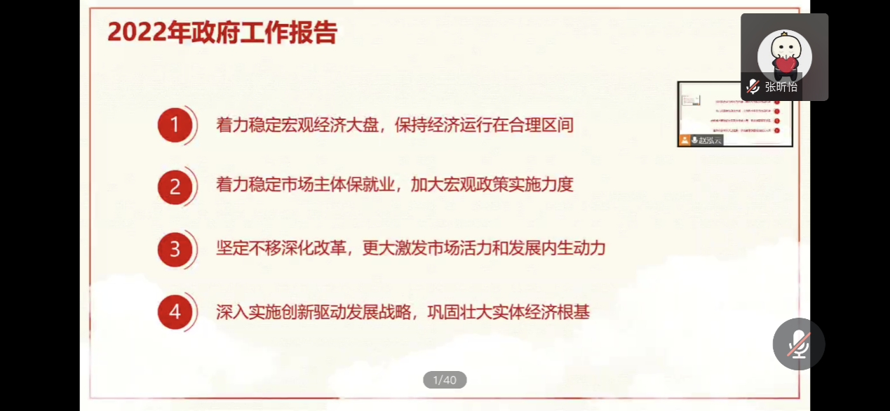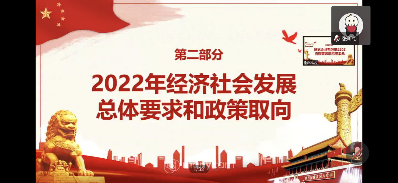 会议开始,赵泓云同志首先以2021年党的重大成就,回顾过去一年政府的七大工作结果,并深入分析具体的工作措施。紧接着她领学了2022年政府工作预期目标,以“解码《政府工作报告》”为主题的视频帮助在场同志更深入地学习与了解。最后赵泓云同志着重讲解了2022年政府工作报告的具体内容。