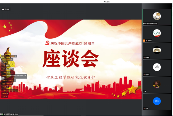 为庆祝中国共产党成立101周年,迎接党的二十大胜利召开,7月1日上午,信息工程学院研究生党支部通过腾讯会议线上召开党员座谈会,会议由支部副书记廖双丽同志主持。
