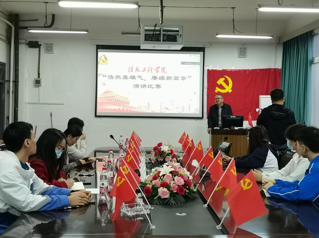 “浩然英雄气,赓续新篇章”讲述英雄故事“演讲比赛”。初赛共收到来自党员和入党积极分子的参赛作品76份,其中,15位同学成功晋级决赛。10月11日下午,演讲比赛决赛于工学楼210会议室成功举行,同时在信息工程学院官方公众号进行现场直播,整个直播过程达1573人观看,点赞次数达18103次。
