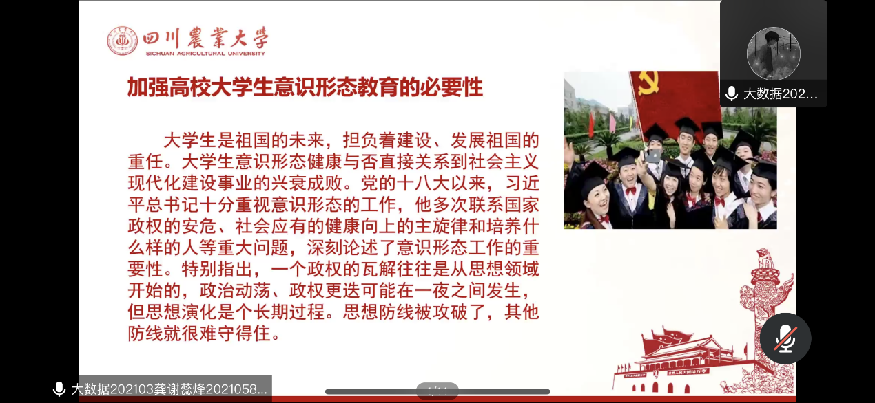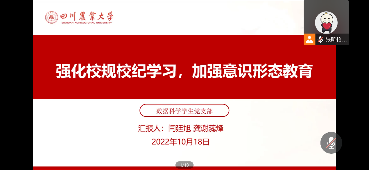 10月18日下午,数据科学学生党支部组织开展了以“强化校规校纪学习, 加强意识形态教育”为主题的线上政治学习会。会议由龚谢蕊烽,闫廷旭同学主持。支部全体同志参加,学习氛围浓厚。