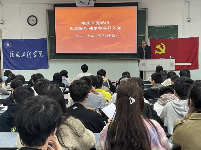 2022年11月8日下午16:30,信息工程学院2022年秋季入党积极分子党校培训班第七讲在十教A403顺利开展。信息工程学院党委书记王中成为本期学员作了以“端正入党动机,以实际行动争取早日加入中国共产党”为主题的专题讲座。