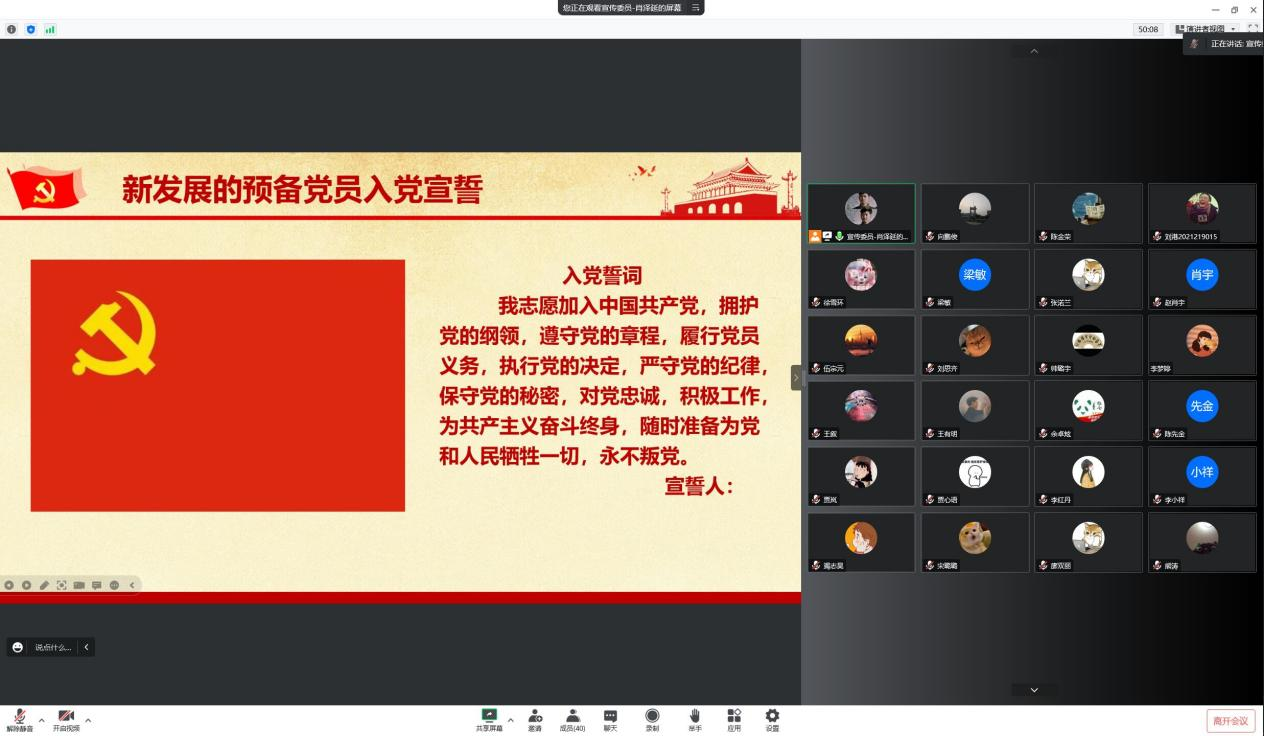 11月22日上午,信息工程学院研究生党支部在线上召开党员大会,研究讨论接收刘思齐等5名发展对象为中共预备党员事宜。大会由宣传委员肖泽延同志主持,全体党员参加大会。