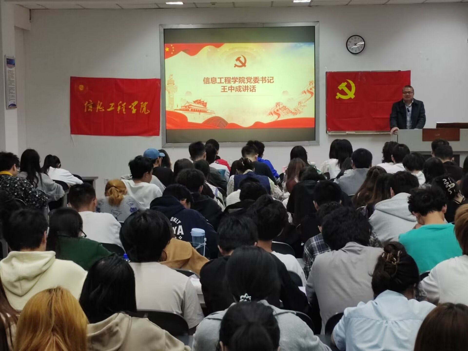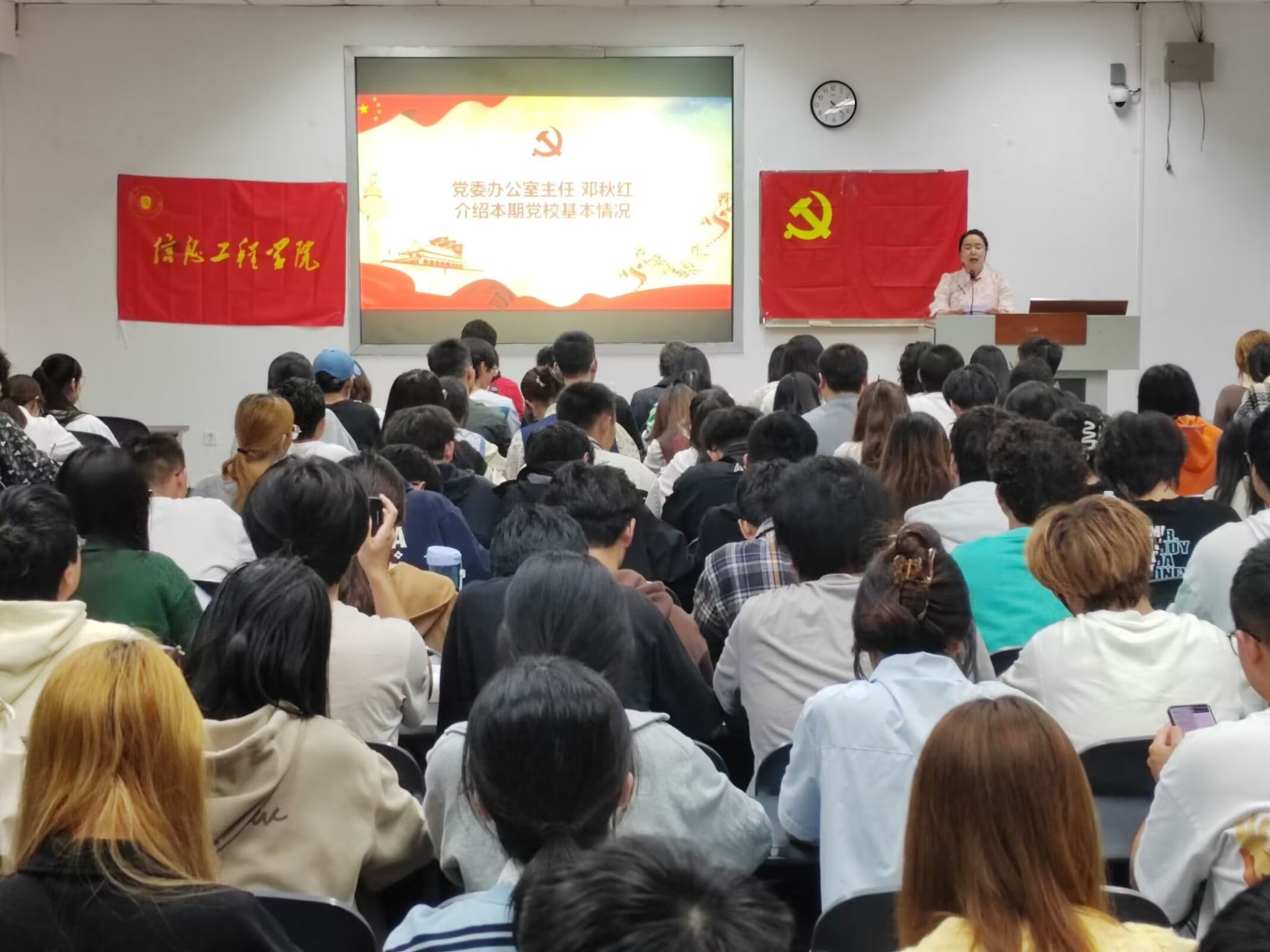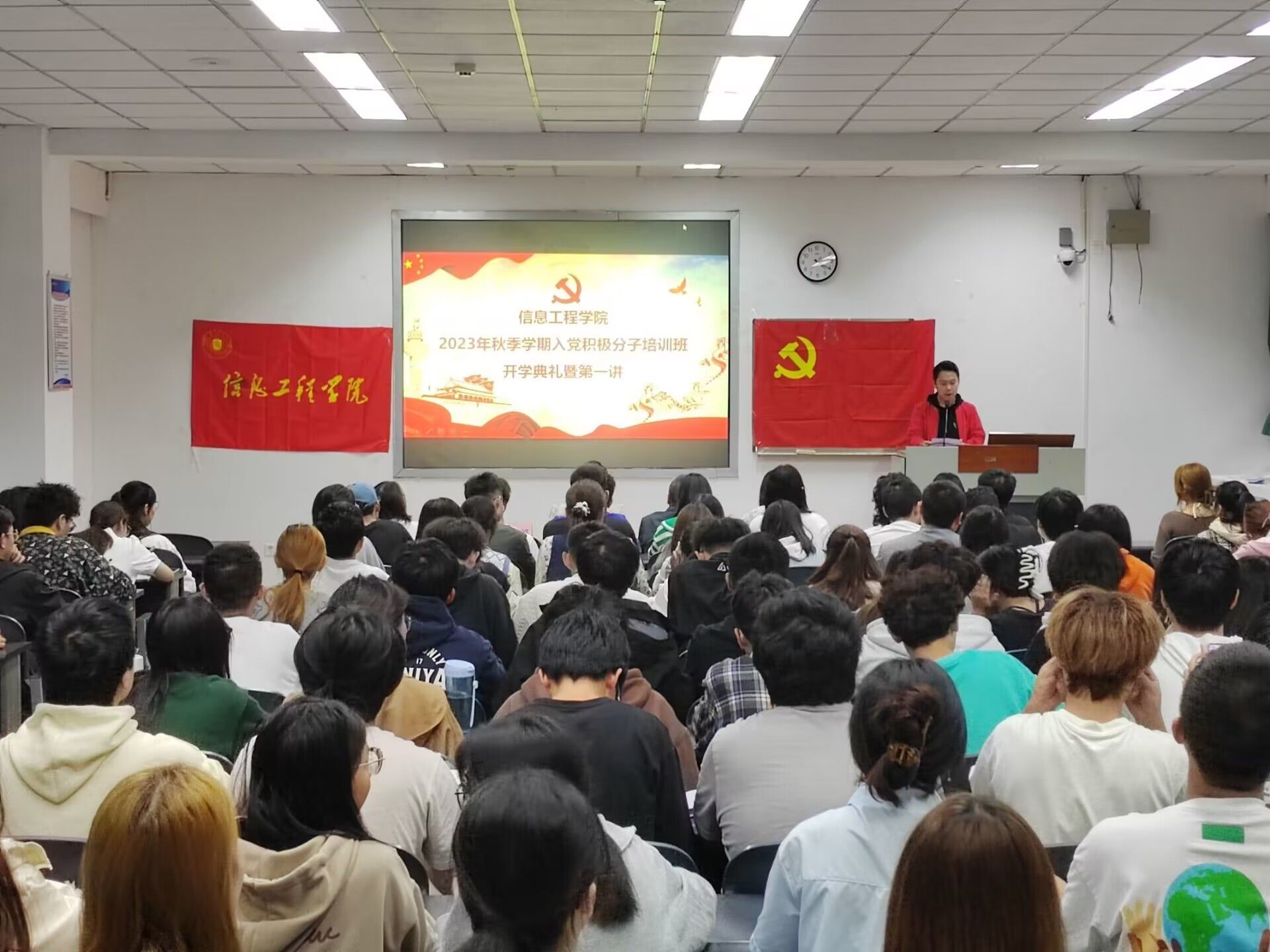 为切实做好入党积极分子的培养工作,提高入党积极分子理论知识水平,深入学习贯彻习近平新时代中国特色社会主义思想主题教育,信息工程学院于10月17日下午16:20在10教B209举行了2023年秋季学期入党积极分子党校培训班开学典礼暨党课第一讲。学院党委书记王中成副教授、全体辅导员老师,142名入党积极分子培训班学员参加典礼。院党委办公室向建桦老师担任主持。