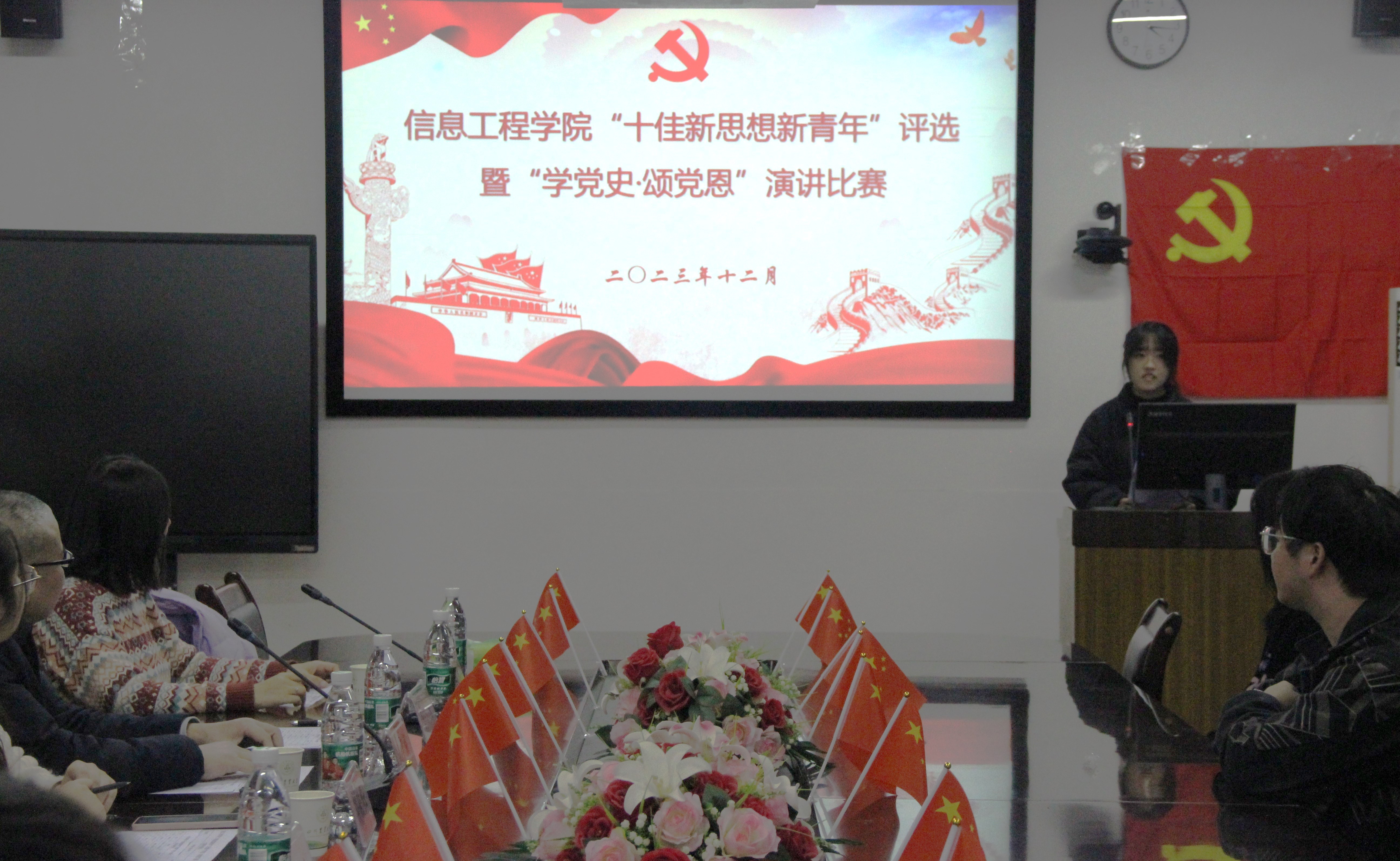 为了深入学习贯彻习近平新时代中国特色社会主义思想,推动党史学习教育持续深化,引导我院青年学生厚植爱党爱国情怀,坚定理想信念,学院特举办“十佳新思想新青年”评选暨“学党史·颂党恩”演讲比赛。大赛决赛于12月13日下午在工学楼210会议室举行,大赛的评委嘉宾有学院党委书记王中成副教授、党委副书记葛飞老师、全体辅导员老师以及研究生支部书记张渃兰同学。