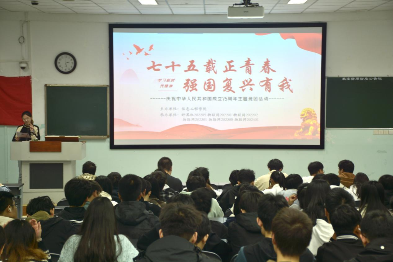 为深入学习宣传贯彻习近平总书记在庆祝中华人民共和国成立75周年招待会上的重要讲话精神,进一步激发广大青年学生的爱国情怀,强化责任担当意识,增进班级凝聚力,共铸强国之梦,计算机202205团支部、物联网202201团支部、物联网202202团支部、物联网202301团支部、物联网202305团支部、物联网202401团支部于11月3日14:20-16:00在十教A101联合开展了“七十五载正青春,强国复兴有我”主题班团活动。