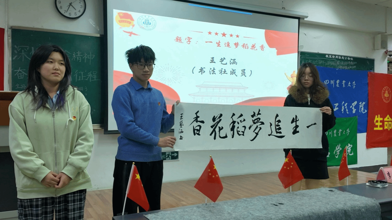 随后,书法社成员王艺涵现场题写“一生追梦稻花香”,以笔墨传递川农学子的精神追求,将现场氛围推向高潮。
