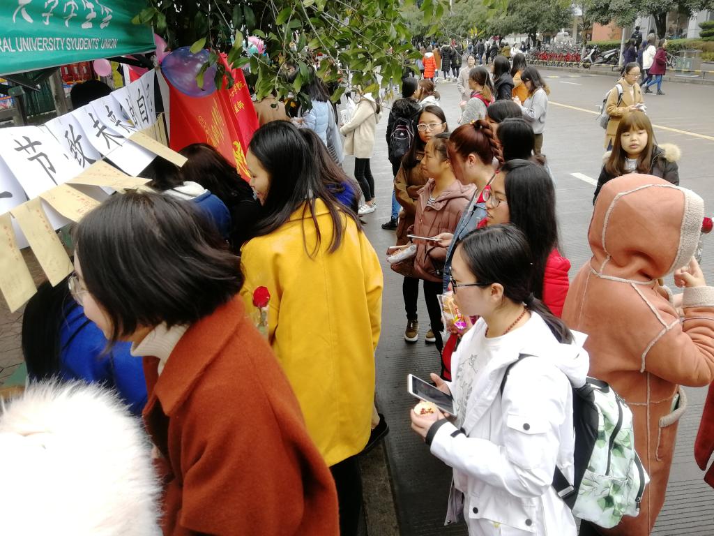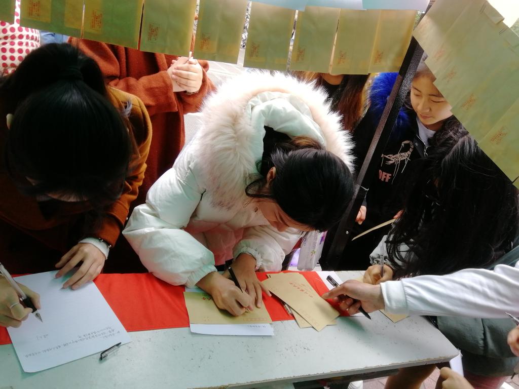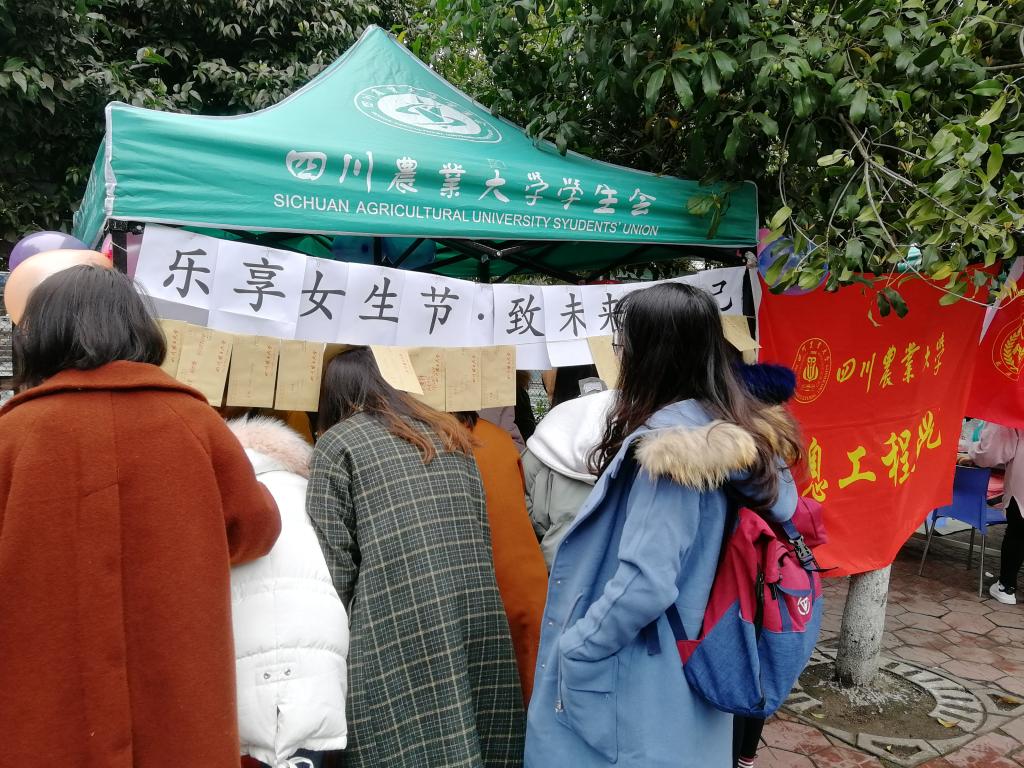 “美女你好,你可以在信签纸上记录下自己生活的点滴以及对未来的期望,并装进信封,投进信箱里。我们权益部代为保存信件,待来年的女生节当天再送回你的手中。参与活动还可以获得一支玫瑰花或一瓶AD钙哦!”权益部工作人员对女同学耐心地讲解着。活动期间,前来参加活动的女同学络绎不绝,纷纷在信签纸上写下自己的心声。有的含情脉脉,写下三行情诗匆匆离去;有的满面春风,写到页尾还不肯放笔。有一位女生前来领取自己去年的信件,迫不及待地拆开,脸上露出得意的笑容,说道:“我的flag都实现啦!”。同学们在路过帐篷时都不禁驻足停留一番,或写下,或取走,留下一路的欢声笑语。临近活动结束时,盒子里装满了女同学们的憧憬和梦想,今年的女生节活动圆满完成。
