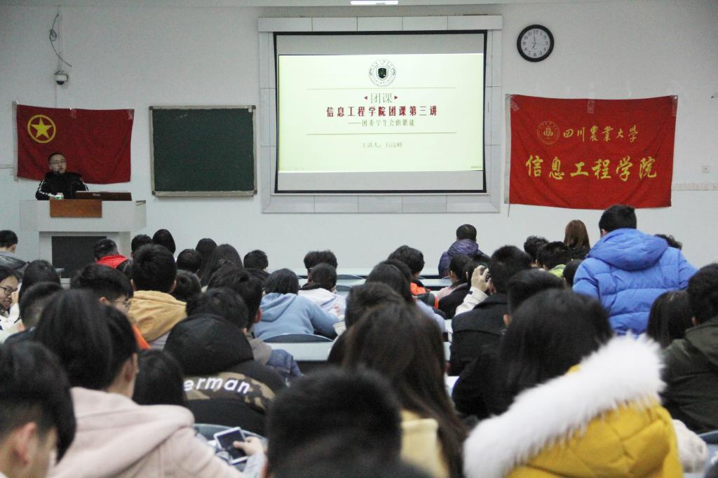 为提高广大团员的政治素养,增强干事对团委学生会的了解。2019年3月3日19:00,信息工程学院第一期团课第三讲——“团委学生会的职能”于育新楼A201召开。本次团课由信息工程学院学生会主席石汶峰担任主讲人,他从“追根溯源”、“自我剖析”、“反思自省”、“未来展望”四个方面为各小班入团积极分子和团委学生会各部门干事近两百人带来了细致全面的讲解。