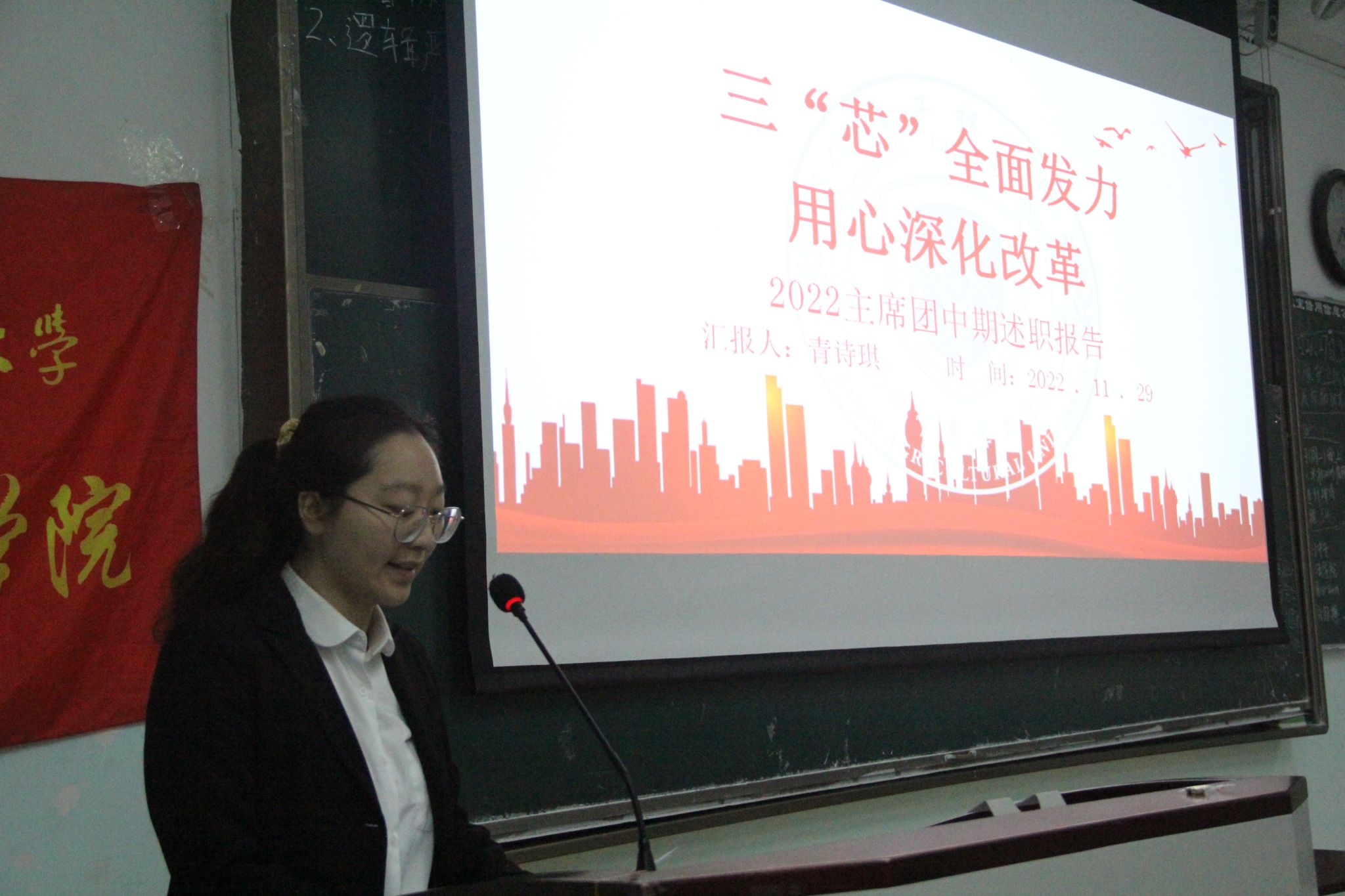 为加强团委学生会建设,提高工作质量,展现我院学生组织的风采,更好开展后续学生工作,信息工程学院于11月29日下午在十教A401开展信息工程学院第九届团委学生会中期述职答辩会。学院党委办公室主任邓秋红老师、学院党委办公室副主任曹小娇老师、党委办公室阿迪力江老师、向建桦老师、主席团成员、各部门主干以及代表线下参会。答辩会由主席团成员赵显梦主持。