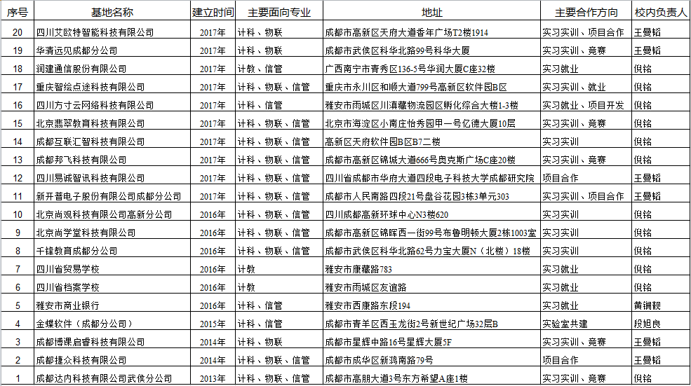 信息工程学院校外实习实训基地统计表
