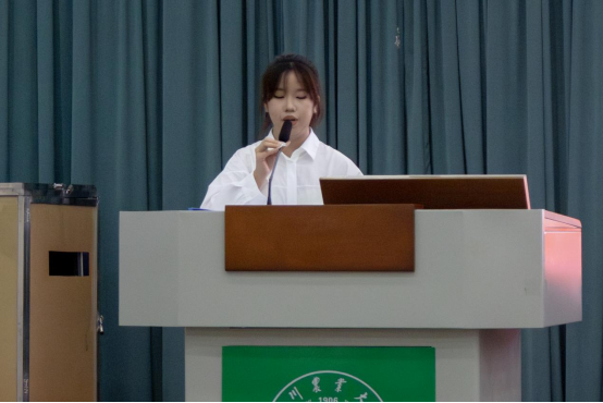 本科生新生代表左如晖结合家乡乡村振兴的实践经历,讲述了自己选择信息工程学院的初心——希望用数字技术赋能乡村发展。他号召同学们志存高远、潜心问学、锤炼品格,共同续写川农大的辉煌篇章!