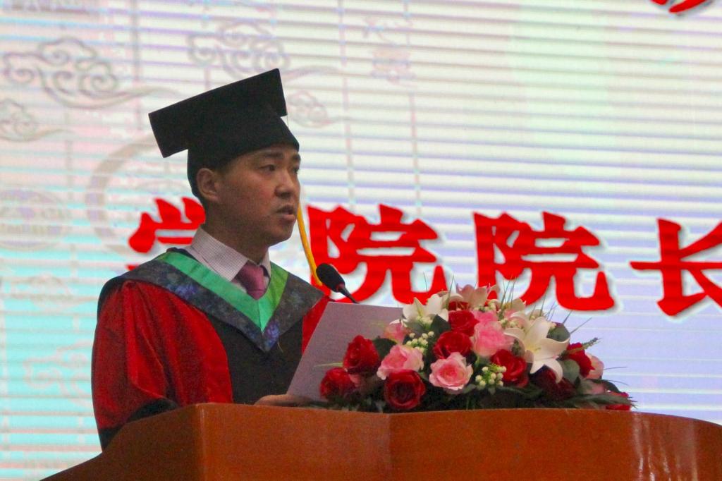 毕业典礼在庄严的国歌声中开始,高雪松院长致辞。他首先代表全院2353名师生向圆满完成学业的2019届毕业生表示热烈的祝贺,号召同学们向所有为他们的成长成才付出辛劳、默默奉献的父母、老师和亲友们表示衷心的感谢!他总结了2019届毕业生取得的突出成绩:在2019届毕业生中,1人获评校级优秀学生标兵;55人光荣加入中国共产党;6人被授予四川省优秀大学毕业生;214人次被评为校级优秀团干部、优秀学生干部、优秀团员、优秀学生、寒梅飘香工程公益之星等荣誉称号;136人次获国家励志奖学金、陈育新优秀学生奖学金等各类奖学金;学生以第一作者发表EI论文8篇,参加省市级以上竞赛获奖22项;有64人继续攻读研究生学位,其中11人到伦敦国王学院、南加利福尼亚大学、伯明翰大学、利兹大学、爱丁堡大学等国际著名学府留学深造,48人进入国防科技大学、中山大学、电子科技大学、厦门大学、上海交通大学等985、211工程大学;102名同学进入腾讯、京东、中国移动、中国联通、中国电信、比亚迪等世界/中国500强企业,其中21名同学被中国人民银行、中国工商银行、中国建设银行、上海浦发银行、招商银行、中国银行等8大银行高薪聘用。他表示,学院全体老师对同学们取得的优秀成绩倍感自豪。对于即将带着理想奔赴新的岗位、面临人生新的起点和希望的毕业生们,高雪松院长分享了三点感悟:一是“保持改变”。他谈到,未来具有不对称性、不确定性和复杂性。不久的将来,简单的、重复性的工作将被人工智能取代。在这场竞争中,我们必须变成创新性学习者,保持在路上、在改变的心态,努力超越自我。二是“懂得敬畏”。凡善怕者,必身有所正,言有所规,行有所止,偶有逾矩,亦不出大格。我们要常怀敬畏之心,方能行有所止。要懂得敬畏自然、敬畏生命、敬畏道德、敬畏法律,时刻保持清醒,保持坦荡,保持品格。三是“静待生活”。在以快为尺度的信息时代,他提醒同学们,要懂得静下来,慢下来,倾听自己的内心,体会生活的真谛。他希望各位毕业生身处“信息技术的需求如此巨大和迫切”的新时代,要做好自己,继续传承和发扬“川农大精神”,“德信立人,以工成事”,“勤学修身,笃行创新”。
