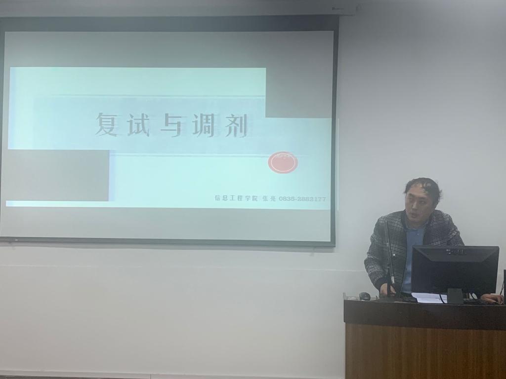 学党史、悟思想、办实事、开新局。今年,信息工程学院有230余名毕业生报考研究生,为让上线的同学都能顺利升学深造,实现高质量就业,3月16日晚,学院在4教210会议室,通过线上直播互动方式为考研学生开展了“考研复试调剂攻略公益直播课”活动,学院研究生就业秘书张亮博士主讲,活动由院党委书记王中成主持。