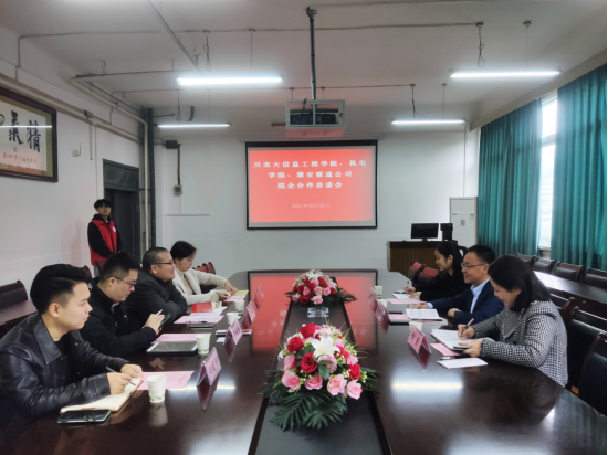 10月28日上午,信息工程学院、机电学院与中国联通雅安分公司顺利举行院企合作洽谈暨授牌仪式。中国联通雅安分公司党委书记、总经理聂代全、人力资源部经理彭燕、信息工程学院党委书记王中成、机电学院党委副书记黄锎靓等人参会。