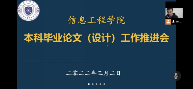 新学期伊始,信息工程学院面临本科毕业论文(设计)工作的巨大挑战,学生人数出现了历史高位。其中,2022届毕业生人数达620人,另有613名2023届学生需要开题。近日,为确保本科毕业论文(设计)工作的顺利开展,信息工程学院召开“本科毕业论文(设计)工作推进会”。按照学校疫情防控要求,会议以在线形式开展,学院党政领导及全体本科生导师参会。会议由教学副院长李军主持。