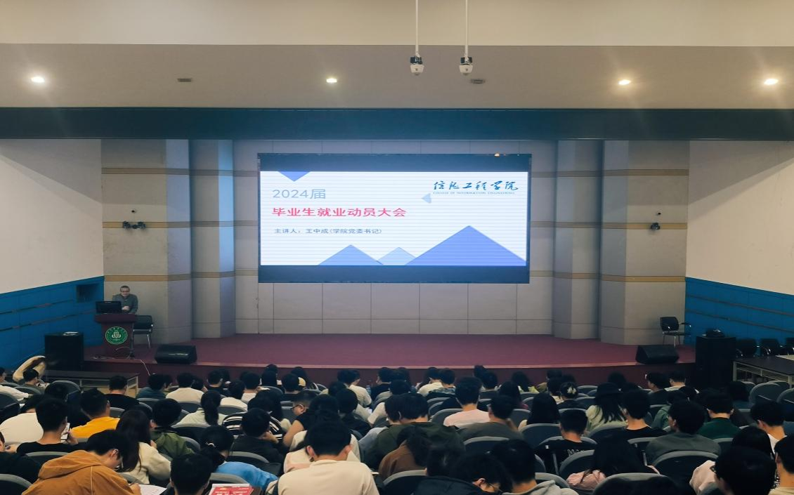 2023年9月27日下午,信息工程学院2024届毕业生就业动员大会于逸夫楼小礼堂成功举行。学院党委书记王中成、全体辅导员以及2024届毕业生全体同学参加本次大会。会议由学院党委办公室向建桦老师主持。