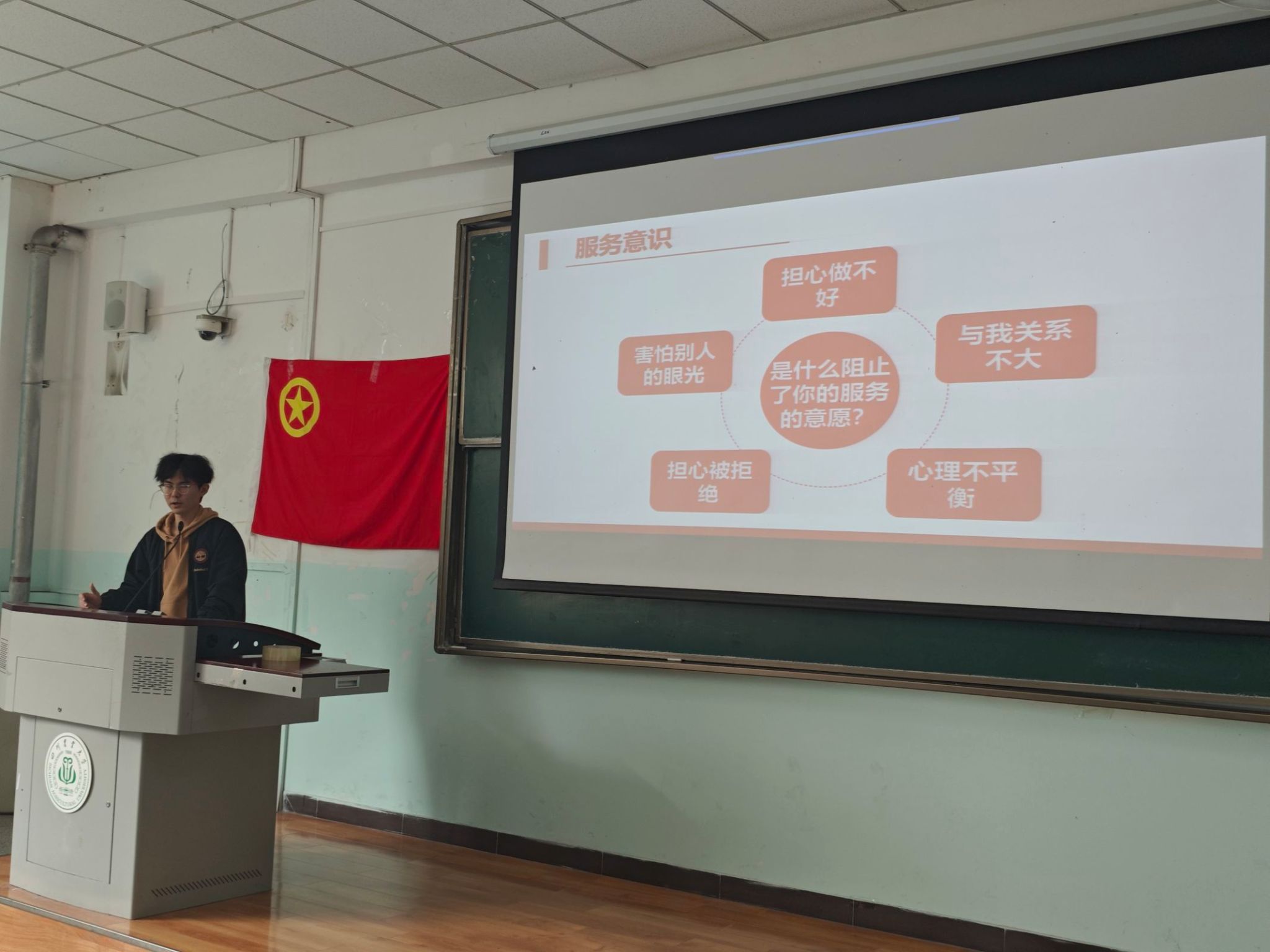 张艺凡围绕“学生干部应具备的意识与能力”展开深刻讲解。他将演讲内容分为“学生干部意识”与“学生干部能力”两个板块进行分析与阐述。在学生干部意识方面,张艺凡依次剖析了作为学生干部应具备的七个意识:“政治意识”“责任意识”“服务意识”“大局意识”“学习意识”“时间意识”和“团队意识”。针对学生干部应具备的能力,张艺凡从“领导力”“执行力”“表达与写作能力”和“心理调节能力”四个方面展开,
