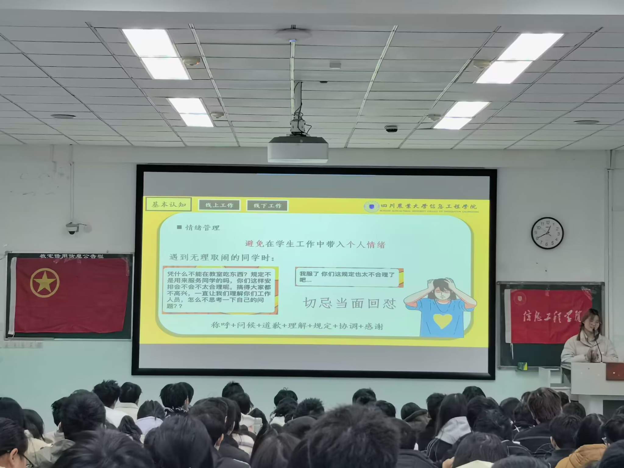 为进一步提升学生干部的礼仪素养,规范其言行举止,11月26日中午,学院在10-A303开展了第八期团校第四讲,主席团成员王君南以学生干部工作礼仪注意事项为题为全体学员进行讲解。