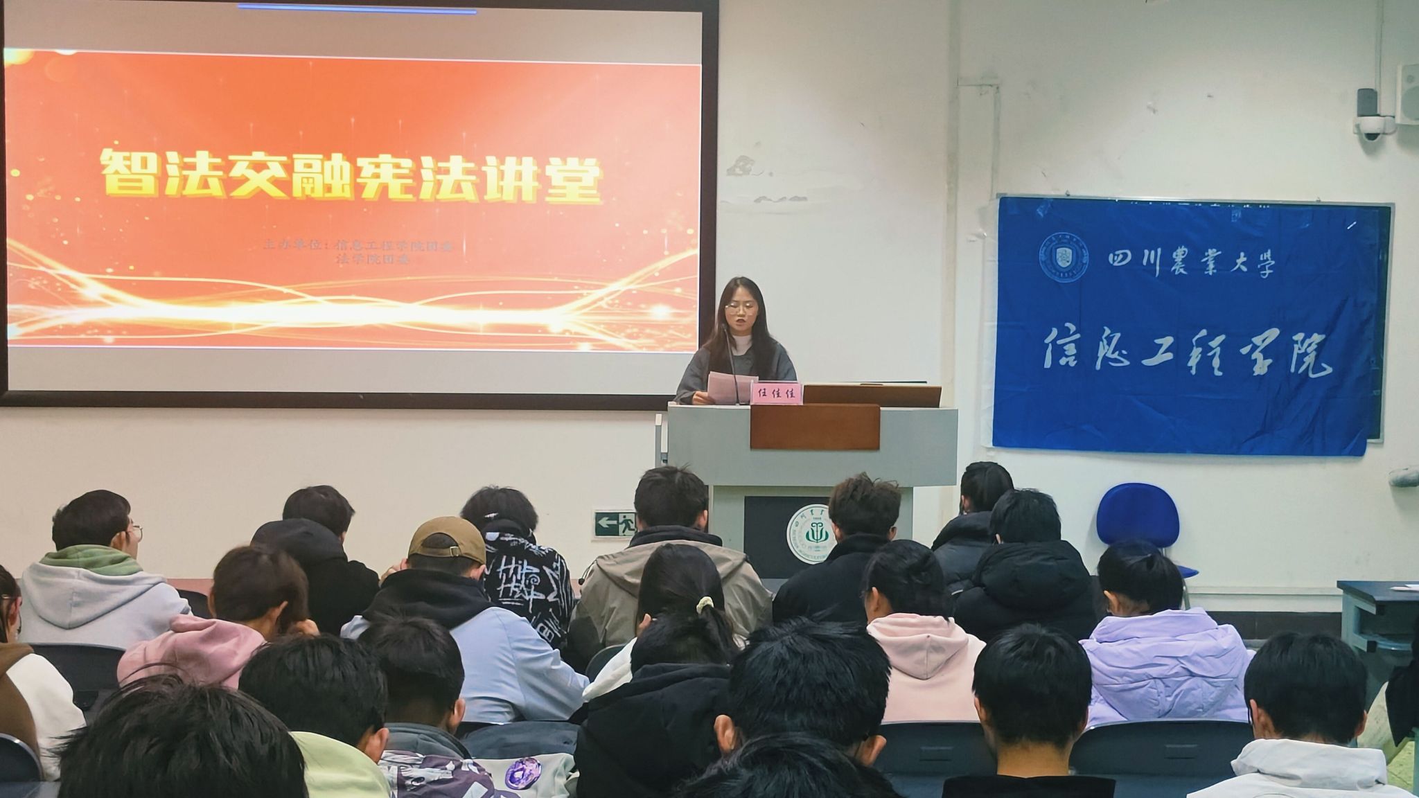 为了弘扬宪法精神,12月3日下午4:30,信息工程学院和法学院在十教B202联合举办了“智法交融宪法讲堂”。来自法学院的汪佳佳同学担任主讲人,为全院170余名同学带来了一场关于宪法的精彩宣讲。