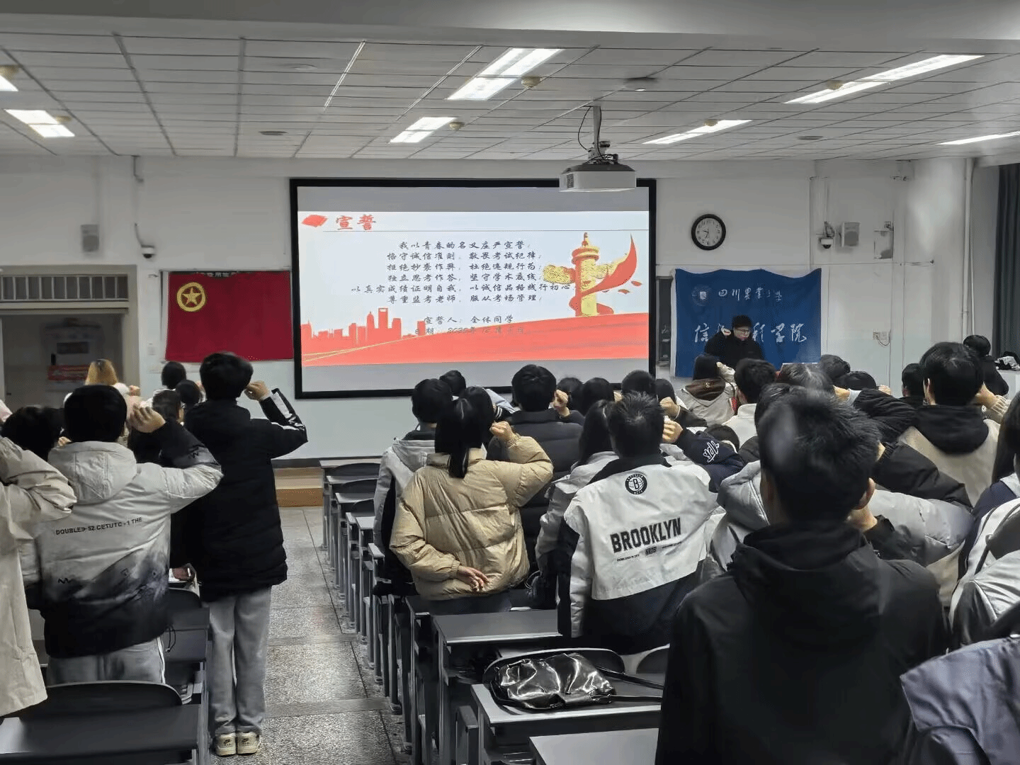 为筑牢诚信考试防线,活动创新采用情景演绎形式开展考风考纪教育。团员们通过模拟考场场景、还原作弊案例,生动展现考场规则与诚信应考的重要意义,打破传统说教模式,让纪律意识在沉浸式体验中深入人心。随后,主持人带领全体同学庄严宣誓,以青春名义承诺敬畏纪律、恪守诚信,坚决杜绝违规作弊行为。