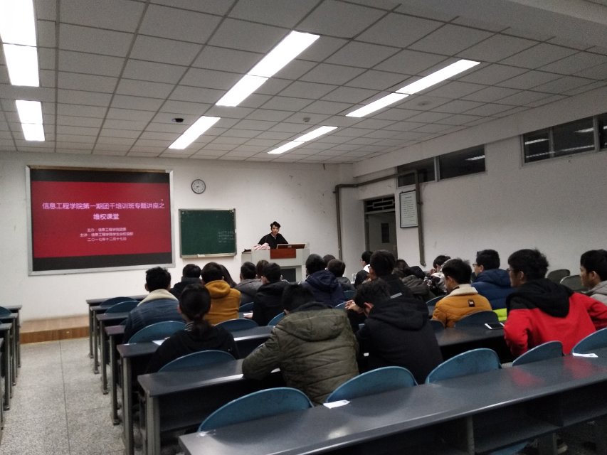 2017年12月17日上午,信息工程学院权益部在十教B-211举行“维权课堂”团干培训专题讲座。各小班学生干部参会。该培训主要是让小班学生干部了解维权知识及权益部的日常工作。