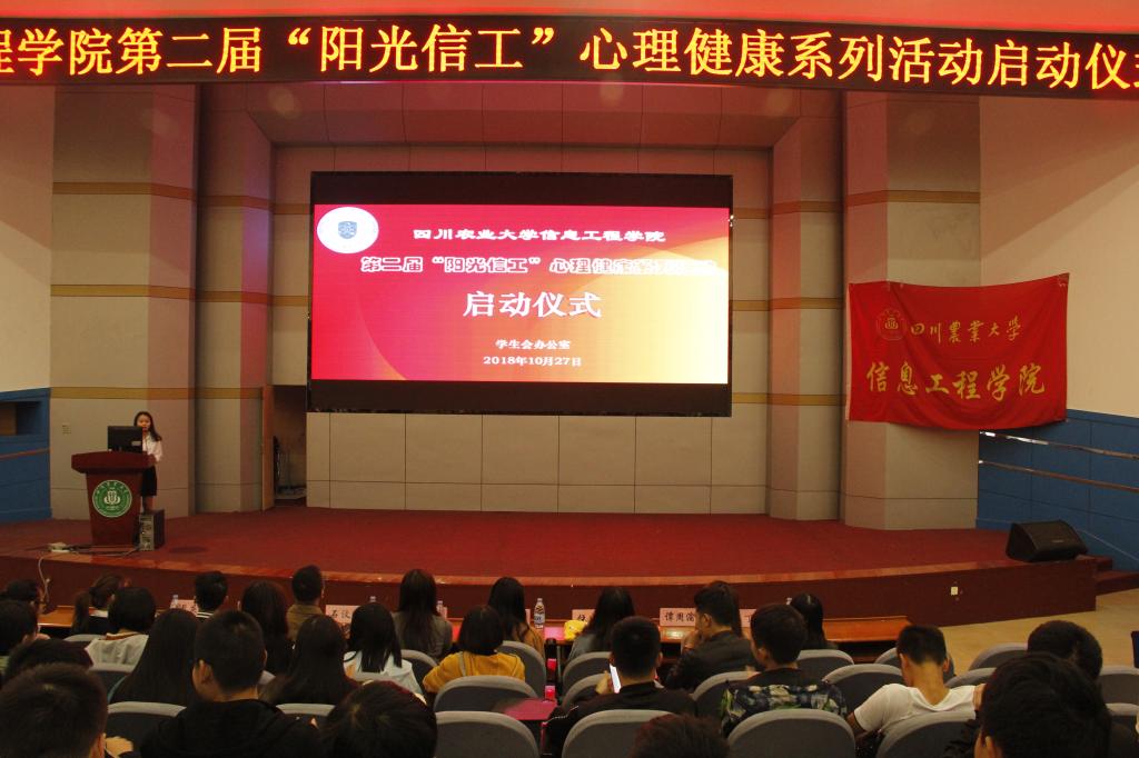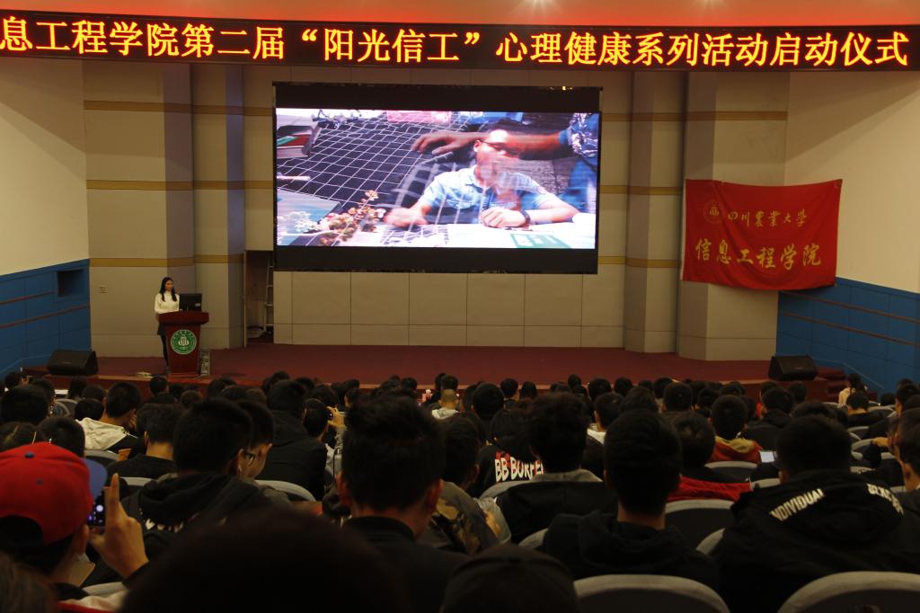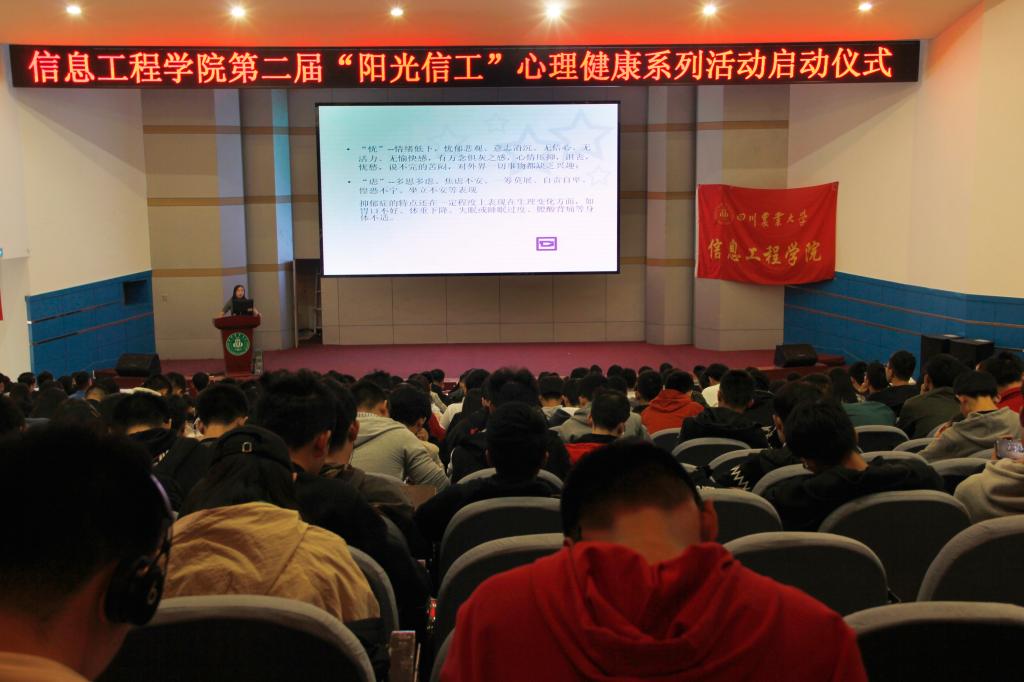 10月27日下午,由信息工程学院主办,信息工程学院学生会办公室承办的第二届“阳光信工”心理健康系列活动启动仪式暨“以信聆心”心理健康教育讲座于逸夫楼小礼堂成功举行。这标志着信息工程学院第二届“阳光信工”心理健康系列活动正式拉开帷幕。学院团委辅导员老师、团委学生会主要学生干部及2018级全体新生参加了此次活动。