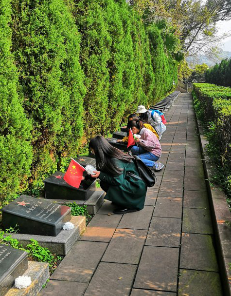 “我们誓以英雄模范为榜样,热爱祖国,拥护中国共产党,践行社会主义核心价值观,铭记历史,面向未来,砥砺才干,完善自身,时刻准备着,为共产主义伟大事业奋斗终生……”一声声铿锵坚定的宣誓声代表着正值青春的当代学子们对烈士做出的庄严承诺,表达了他们为共产主义事业奋斗终生的决心和愿望。在烈士纪念碑前高唱国歌、献花、默哀、鞠躬、致悼词,整个悼念仪式进行得庄严肃穆,井然有序,表达对学生代表们对烈士们深深的哀思和敬意。学生代表陈时敏在悼念词中说道:“我们今天的扫墓绝不仅仅只是一个形式,扫墓是追忆,是缅怀,是灵魂的碰撞。作为当代青年,我们要铭记先烈的丰功伟绩,要时刻严格要求自己,努力学习,刻苦奋斗,为实现中华民族伟大复兴的中国梦贡献自己的一份力量”。