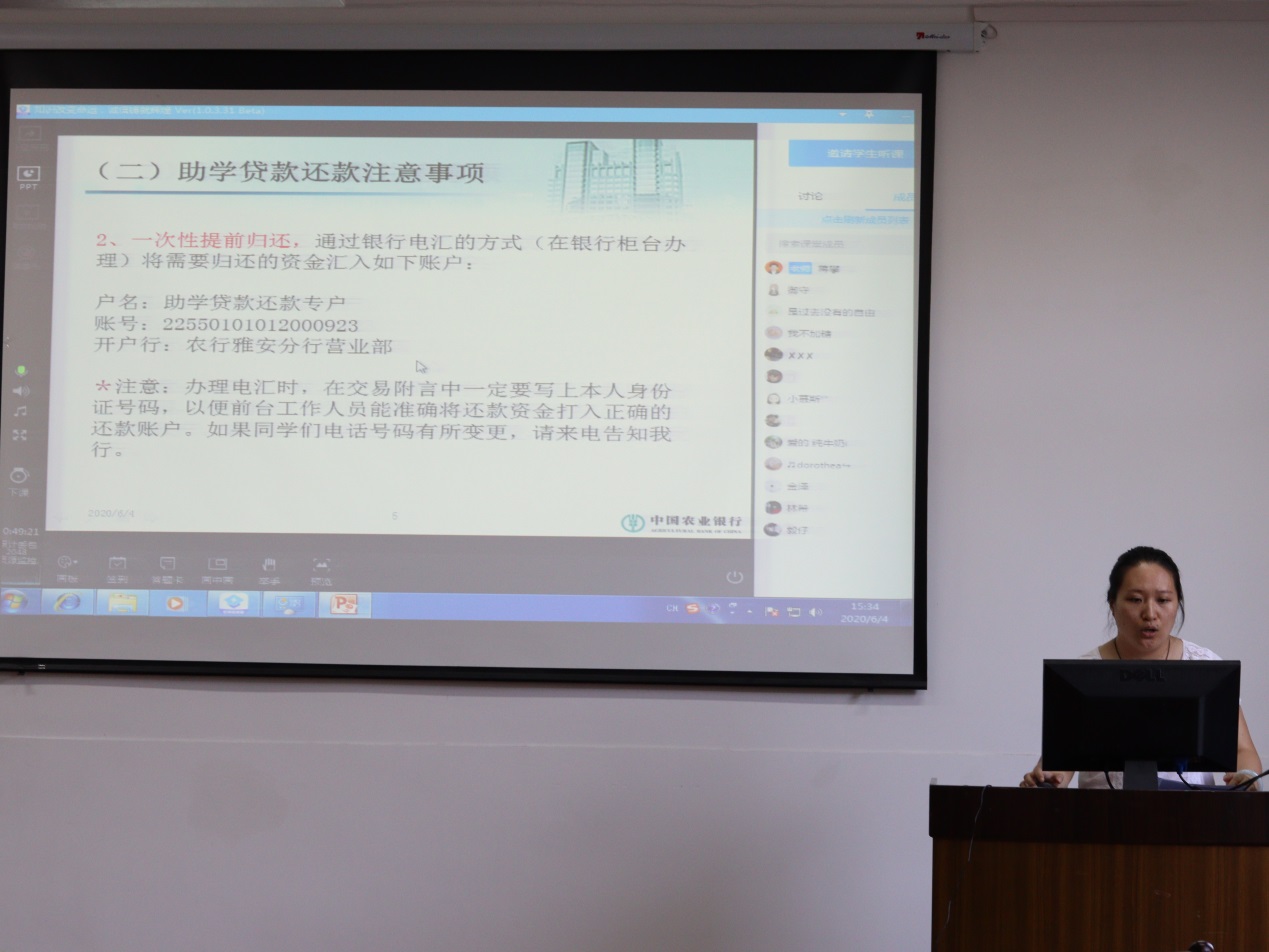 首先是中国人民雅安分行的骆怿进行宣讲,通过征信的发展、日常应用以及常见热点问题讲解了征信的基本概念,强调了保护个人信用的重要性。接下来,由中国农业银行雅安分行的赵尉伶和农村商业银行的赵跃依次宣讲,分别从助学贷款及征信对贷款审核影响和个人征信对贷款准入的影响讲解相关知识,同时强调了理性消费的观念。虽然是线上讲座,但这并不影响同学们积极学习和互动的热情。直播讨论区的提问环节,同学们踊跃发言提出自己的疑问,三位负责人也耐心细致地为同学们答疑解惑,本次“云讲座”顺利开展。
