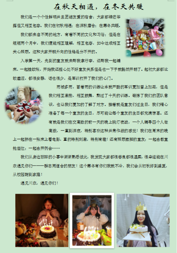 初入校园最早遇见的伙伴便是室友,往后的学习生活中日日在身旁的也是室友。“最好的相遇”书信大赛的举办,让参赛者以书信的形式表达对室友想说的话,记录和室友之间的趣事。参赛者笔下,室友是生活中那帮可爱温暖的姐妹,是陪自己一起打闹的好友,是上铺那位温柔细心的同学,是大学期间一起参加比赛、并肩作战的战友,更是在受挫时守候在旁的伙伴……无论如何前行,难得的室友情都是校园生活中一笔最宝贵的财富。