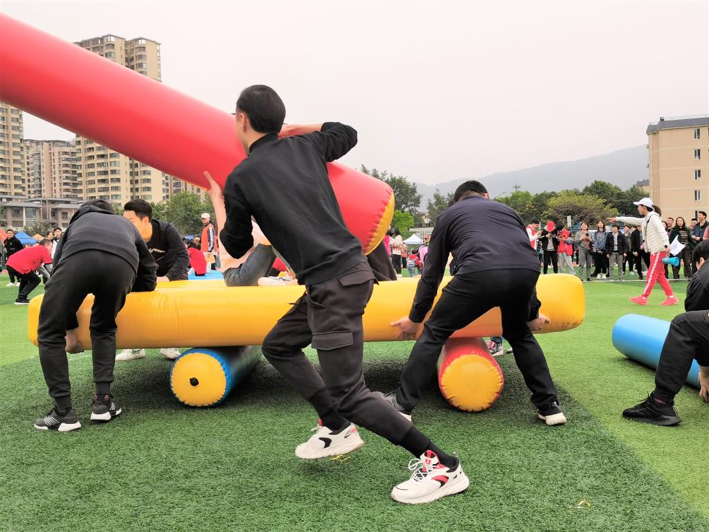开幕式之后,校运会教工组的比赛也陆续展开。上午微风阵阵,气温略低,老师们参赛的热情并没有因此退却。本次校运会教工组的项目巧妙地将竞技与趣味相结合,共设置障碍跑、修桥铺路、八仙过海、陆地飞船、众心捧月、毛毛虫竞速六个项目,老师们在比赛中更注重对各个项目的体验感、参与感。