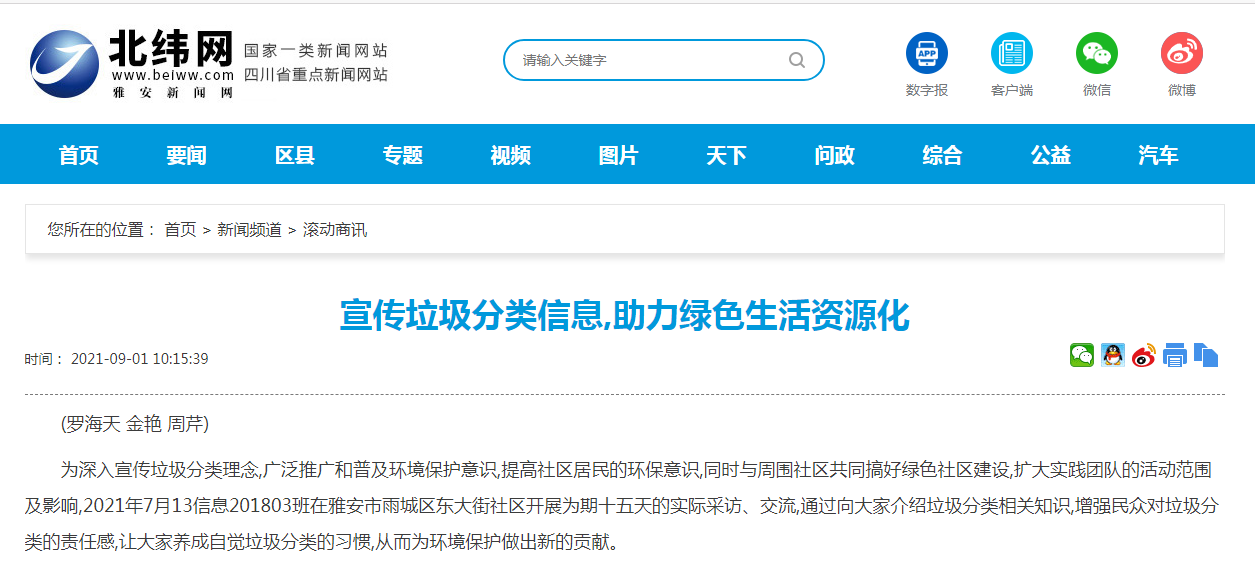 近年来,随着掀起的垃圾分类的热潮,人们逐渐对垃圾分类有了一定的了解,生活环境也有所改善,可是由于生活习惯等方面的问题,垃圾分类的实施效果仍然存在不少的问题。因此,为提升人民群众保护环境的意识,提高环境生存质量,2021年7月13日——2021年7月20日太阳集团tyc86信息201803班在雅安市雨城区东大街社区开展了以“倡导垃圾分类,保护生态环境”为主题的实践活动,通过向大家介绍垃圾分类相关知识,呼吁更多的人进行垃圾分类工作,增强对垃圾分类的责任感,让大家养成自觉垃圾分类的习惯,从而为环境保护做出新的贡献。