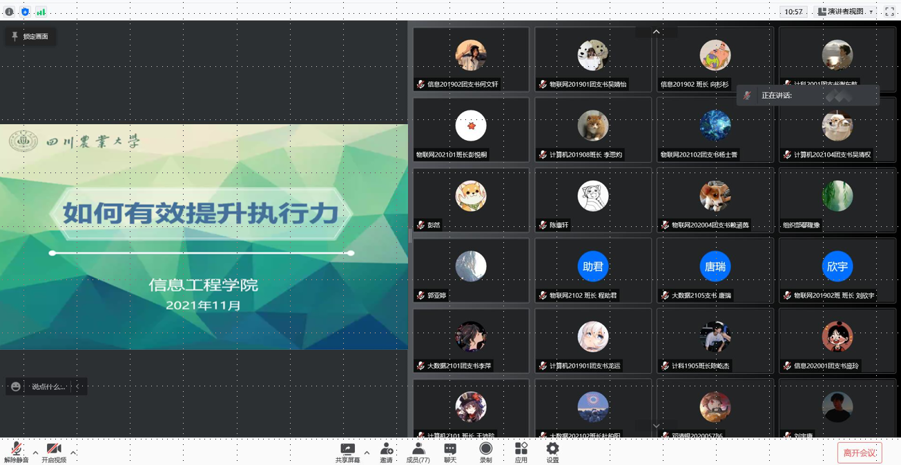 2021年11月24日,学院在线上开展第十期团校开班仪式暨团校第一讲。学院团委书记陈明滟老师出席仪式并担任主讲嘉宾。学院第十期团校学员由各小班新任班长支书组成。