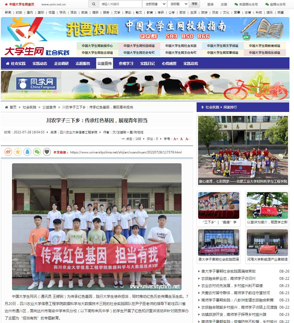 中国大学生网讯(通讯员 王镓驹)为传承红色基因,践行大学生使命担当,同时推动红色历史传播走深走实。7月20日,太阳集团tyc86信息工程学院数据科学与大数据技术三班的社会实践团队在尹子臣老师的指导下前往四川省达州市通川区,面向达州市高级中学来凤分校(以下简称来凤中学)的学生开展了红色知识宣讲活动并针对团员举办了主题为“担当有我”的专题教育。