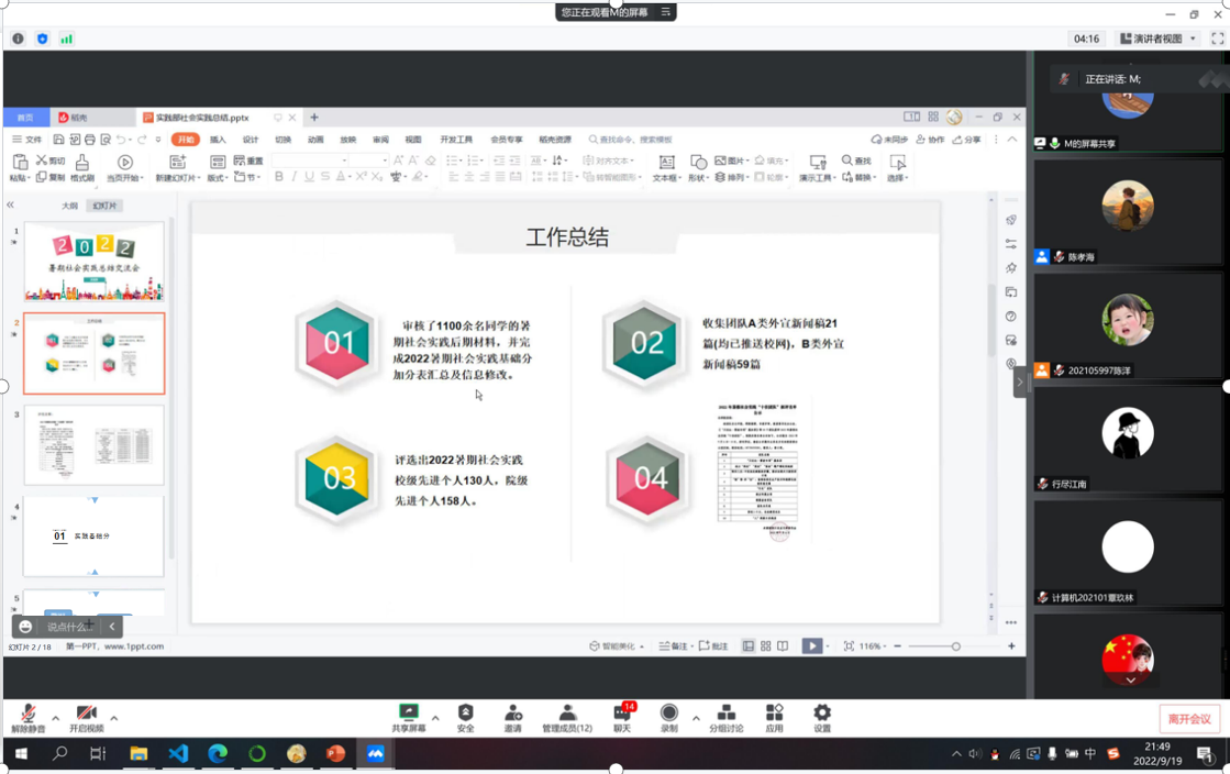 为巩固信工院2022年暑期社会实践成果,激励信工学子在社会实践活动中“受教育、长才干、做贡献”,引领广大信工学子聚焦社会、深入实践。信工院实践总结分享会于9月19日在线上召开。党委办公室文老师、学生实践与志愿服务部负责人、实践部部长及分管主席参会。