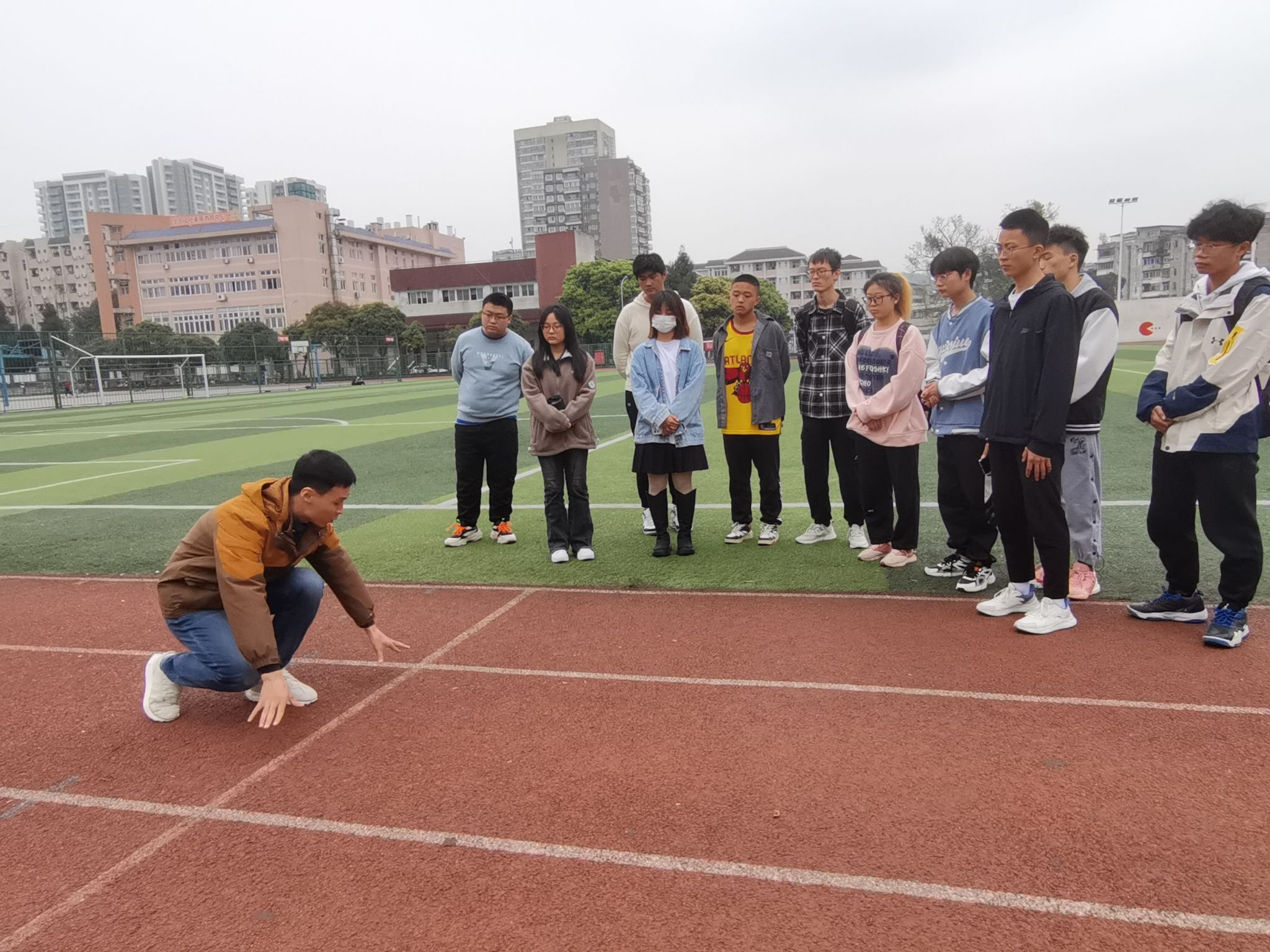 文毅老师首先着重强调安全事项,他提出,无论是在选拔还是训练中,安全要放在最首要的位置。疫情后,学生身体机能恢复情况不明确,选拔、训练前均要让同学们热身充分,安安全全地进行校运会的选拔训练活动。在选拔和训练方面,文毅老师向体育部学生干部仔细介绍校运会设置的每一项田径运动项目和集体项目参赛人员的选拔方法与标准,他还亲自在跑道上示范“蹲踞式”起步机巧,以期选拔出有实力的运动员。他强调,训练时,千万不要一上场就猛运动,务必要循序渐进,当身体适应后再逐步加大训练量;同时,要规划好后期训练计划,挖掘运动员们的潜力,为开展校运会争得好成绩走好充分准备。