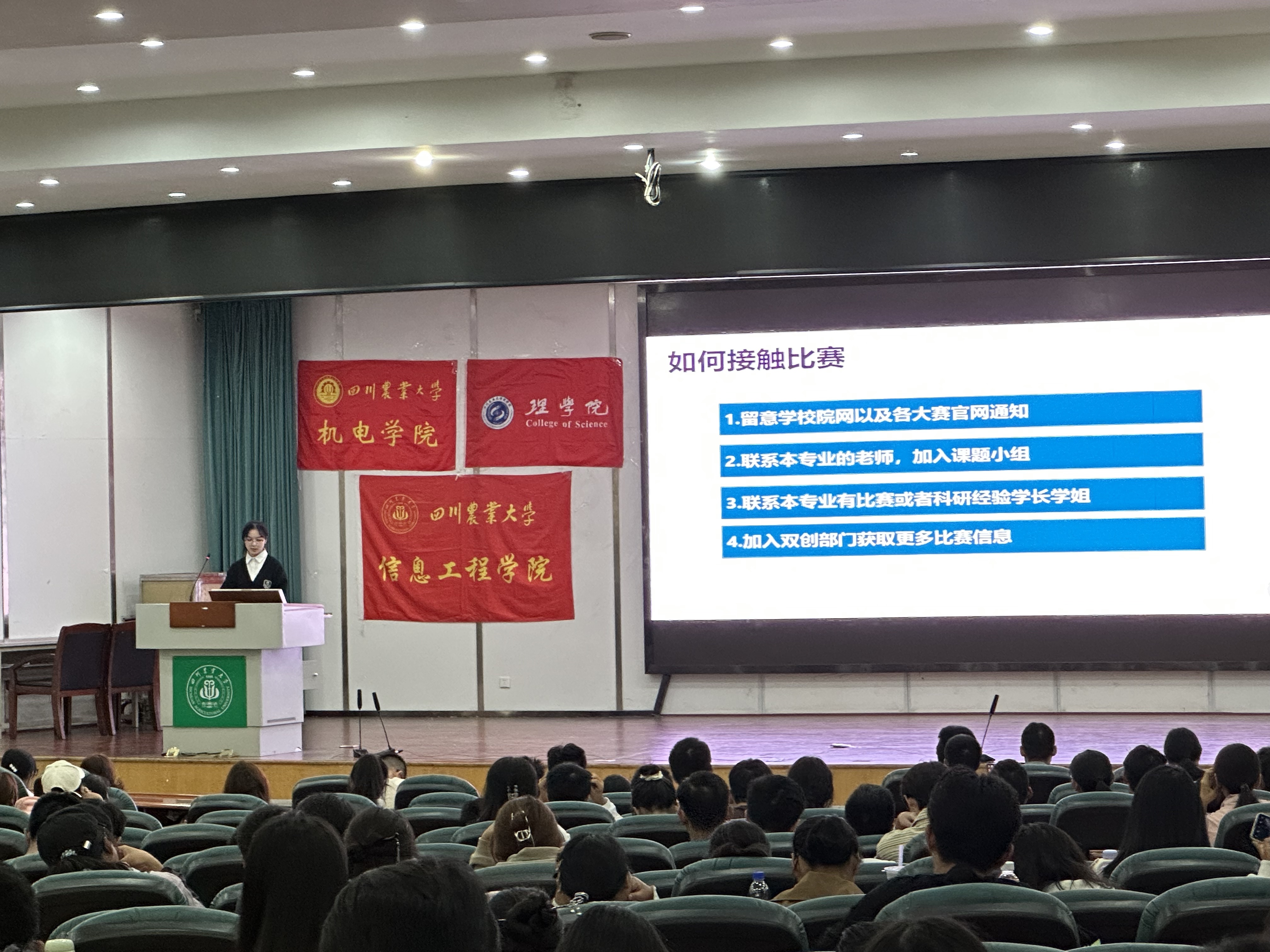 首先,吴佳怡系统介绍了三大赛事以及学校相关的双创政策,鼓励同学们积极加入部门、实验室,与老师联系,积极参与创新创业比赛。黄琨则重点分享了与服务类项目相关的经验。他谈到,服务类项目是一个“看见、行动、改变”的过程,只有通过亲身体验才能产生感动和触动,进而激发思考和行动,最终实现改变。来自“橘祥如意”团队的王先垚通过项目的介绍让同学们知晓了项目从立项到落地所面临的困难,包括团队外部资金问题、团队内部技术问题和解决方法,让同学们更深刻地理解了从“0到1”的创新过程。最后,“育鸭有道”团队的谢天宇分享了他对双创的理解,认为双创不仅仅包括“创新”和“创业”,更根植于“创造”。他鼓励同学们要有敢拼敢闯的精神,用热忱探索创新创业之路。
