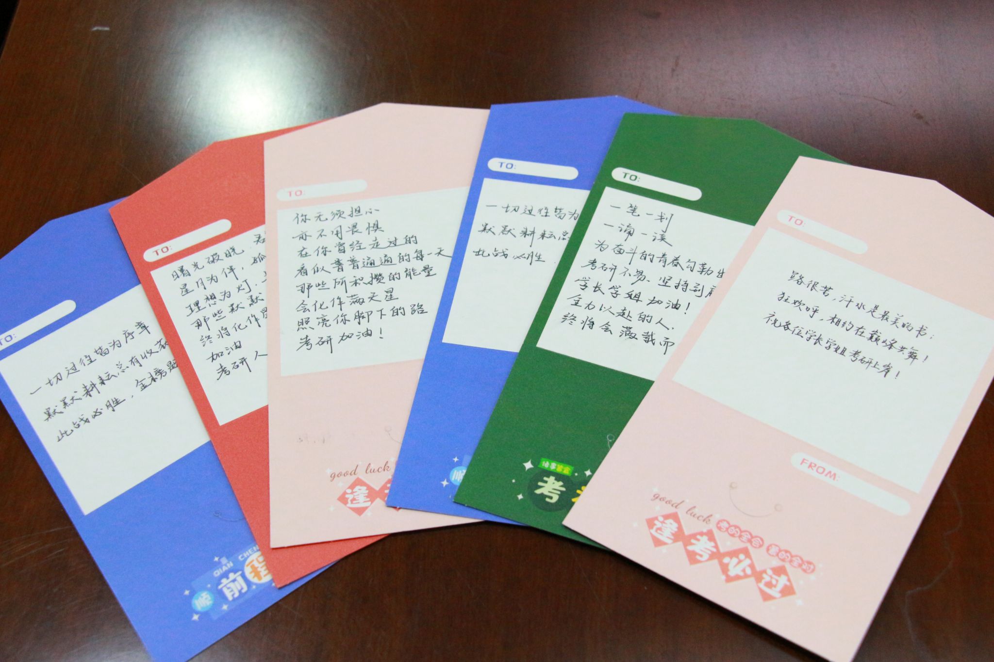 近200名同学领到了学院精心准备的“能量加油包”。礼包中,“暖胃”的食品如士力架、棒棒糖、面包和牛奶,为同学们提供了实实在在的能量。“暖身”的物品如暖宝宝、蒸汽眼罩,为同学们驱散冬日的寒冷。尤其值得一提的是,学院特别组织学弟学妹们在印有“金榜题名”“考神附体”等祝福贺卡上亲手写下一句句“暖心”的鼓励。“长风破浪会有时,直挂云帆济沧海。相信自己,祝考试顺利!”“考研不易,坚持到底的都是勇士,全力以赴的人,终将会满载而归!”……表达了全院师生对备考学子们拳拳的祝福和关心之情。