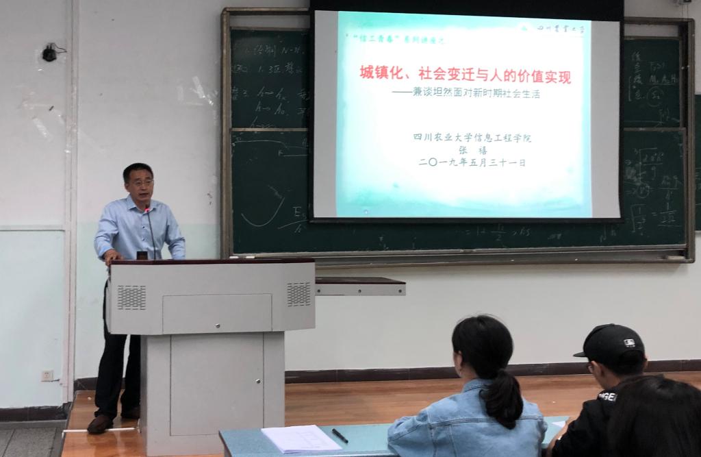 在近来学校生命安全问题事件突发的背景下,为了调整学院同学们的心态,乐观积极面对学习及生活中遇到的困难,树立积极的人生态度,养成良好的思维方式,5月31日下午4:30,信息工程学院第十三期“信工青春”系列思政教育主题讲座在育新楼A401顺利开展。本次讲座以“城镇化、社会变迁与人的价值实现——坦然面对新时期社会生活”为主题,特邀学院党委书记张禧教授担任主讲人。学院17、18级各小班全体和团委学生会全体主干到场聆听。