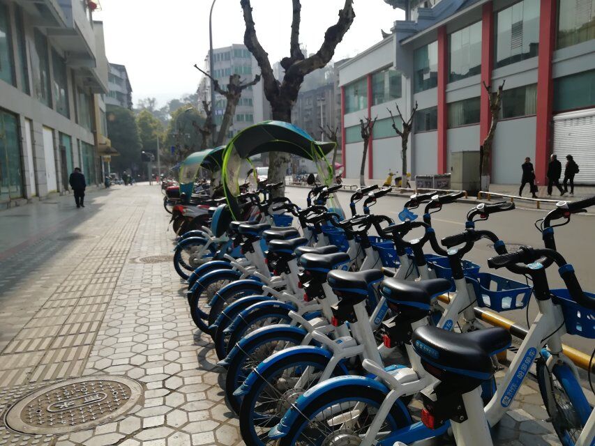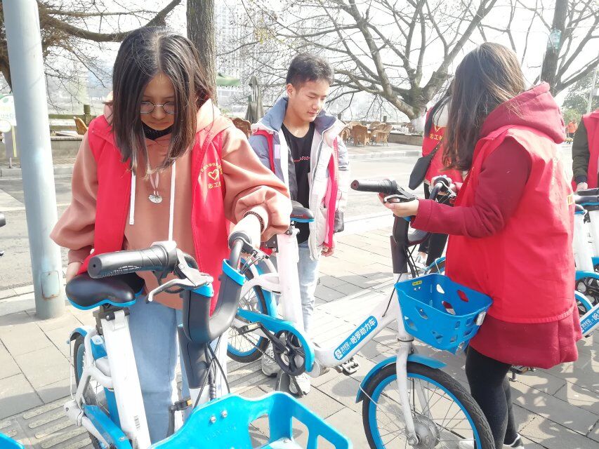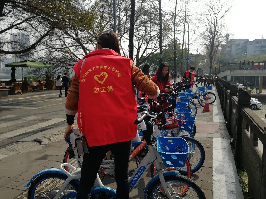 (志愿者们同心协力、干劲十足地在雅安市博物馆门口整理自行车,既锻炼了自己,又方便了他人)