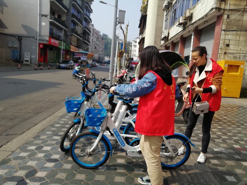 (志愿者第一小分队在系西大街社区整理乱停乱放的自行车,赢得路人称赞)